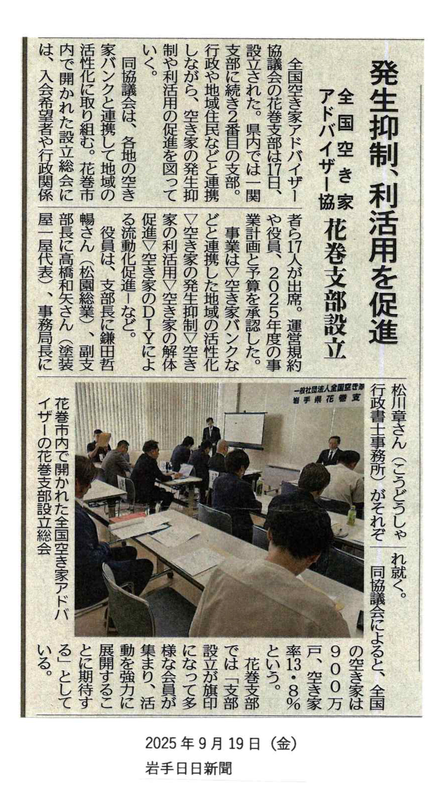 2025年9月19日岩手日日新聞に、全国空き家アドバイザー協議会の花巻支部が設立されたことを掲載いただきました。