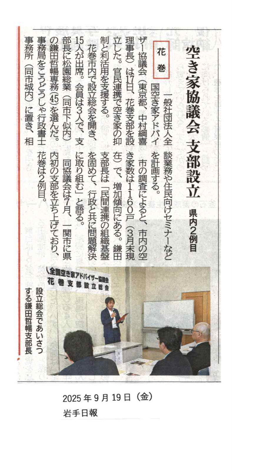 2025年9月19日岩手日報に、全国空き家アドバイザー協議会の花巻支部が設立されたことを掲載いただきました。